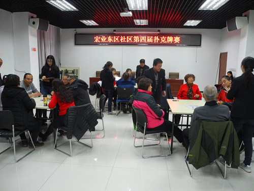 | 为丰富社区居民精神文化生活,培育健康向上的生活方式和道德情操,宏业东区社区于11月23日下午在社区活动室举办了第四届扑克牌友谊赛。社区20余名居民参加了此次比赛。